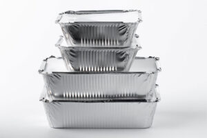 Aluminum takeout containers are recyclable. Please scrape out food and give them a quick rinse.