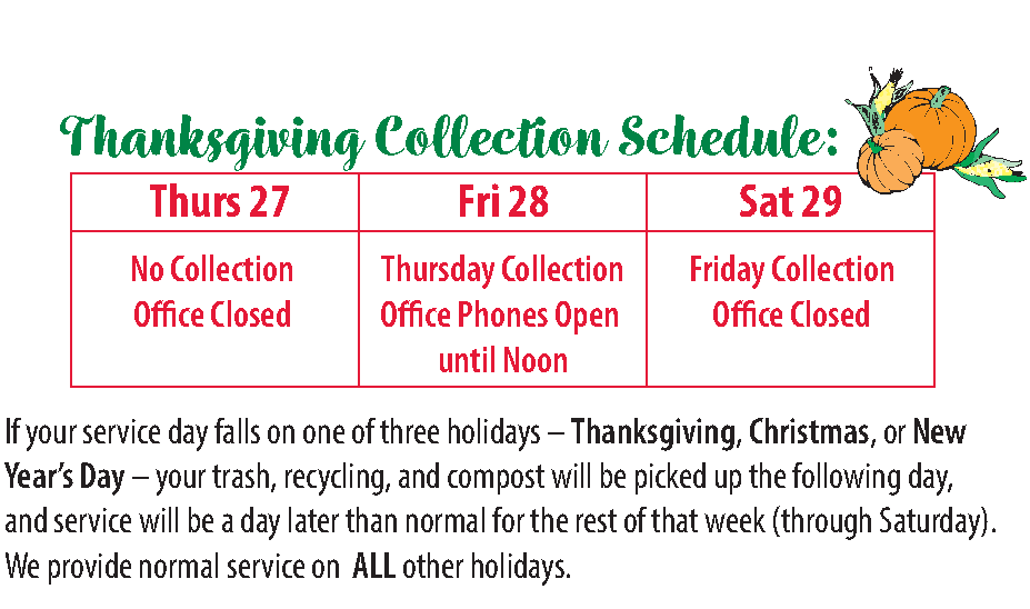 If your service day falls on one of three holidays — Thanksgiving, Christmas, or New Year’s Day — your trash, recycling, and compost will be picked up the following day, and service will be a day later than normal for the rest of that week (through Saturday). An announcement of office hours will be included in advance in your billing statement and posted on our website and social media. We provide normal service on ALL other holidays (Memorial Day, Independence Day, Labor Day, etc.).